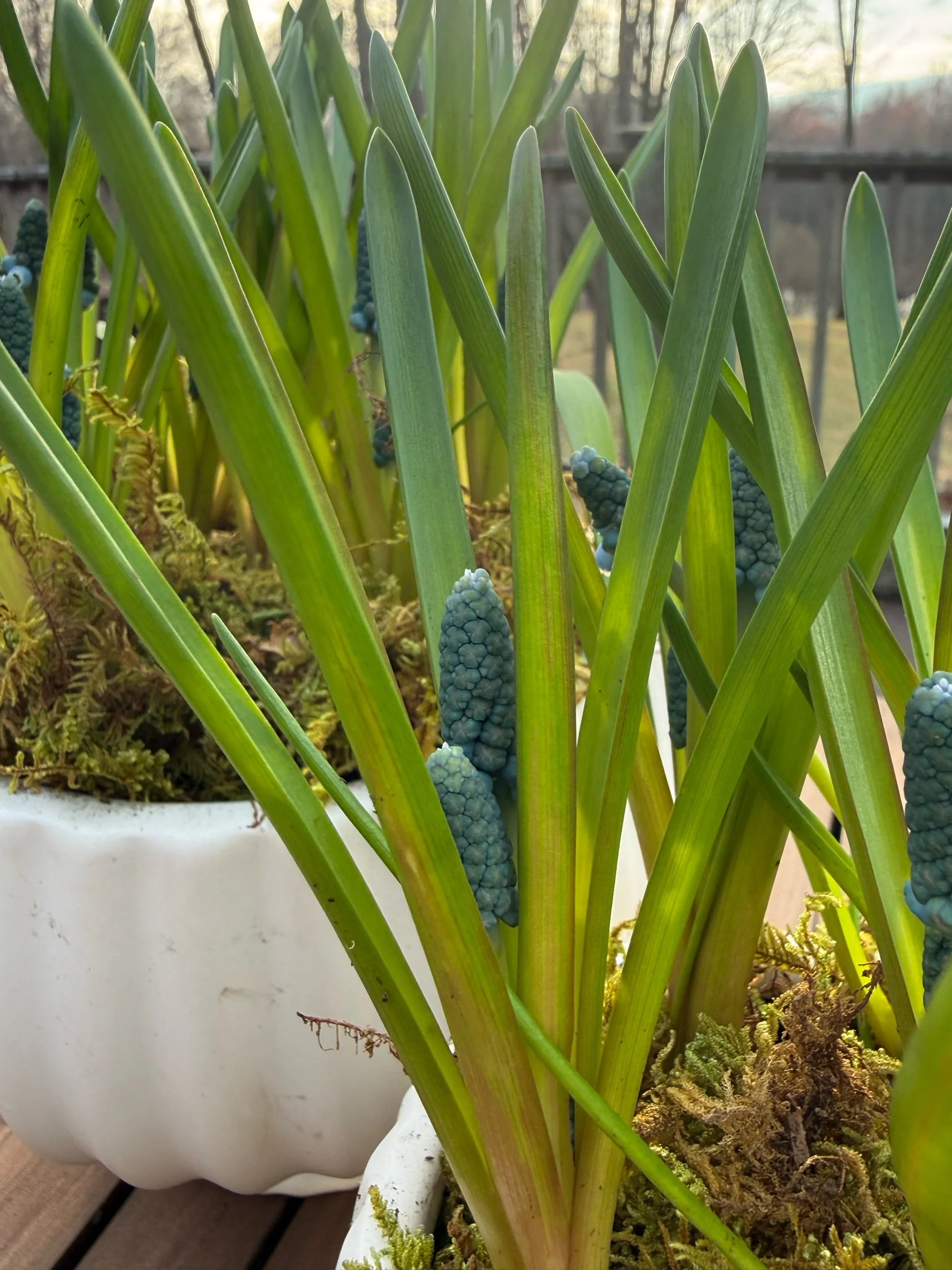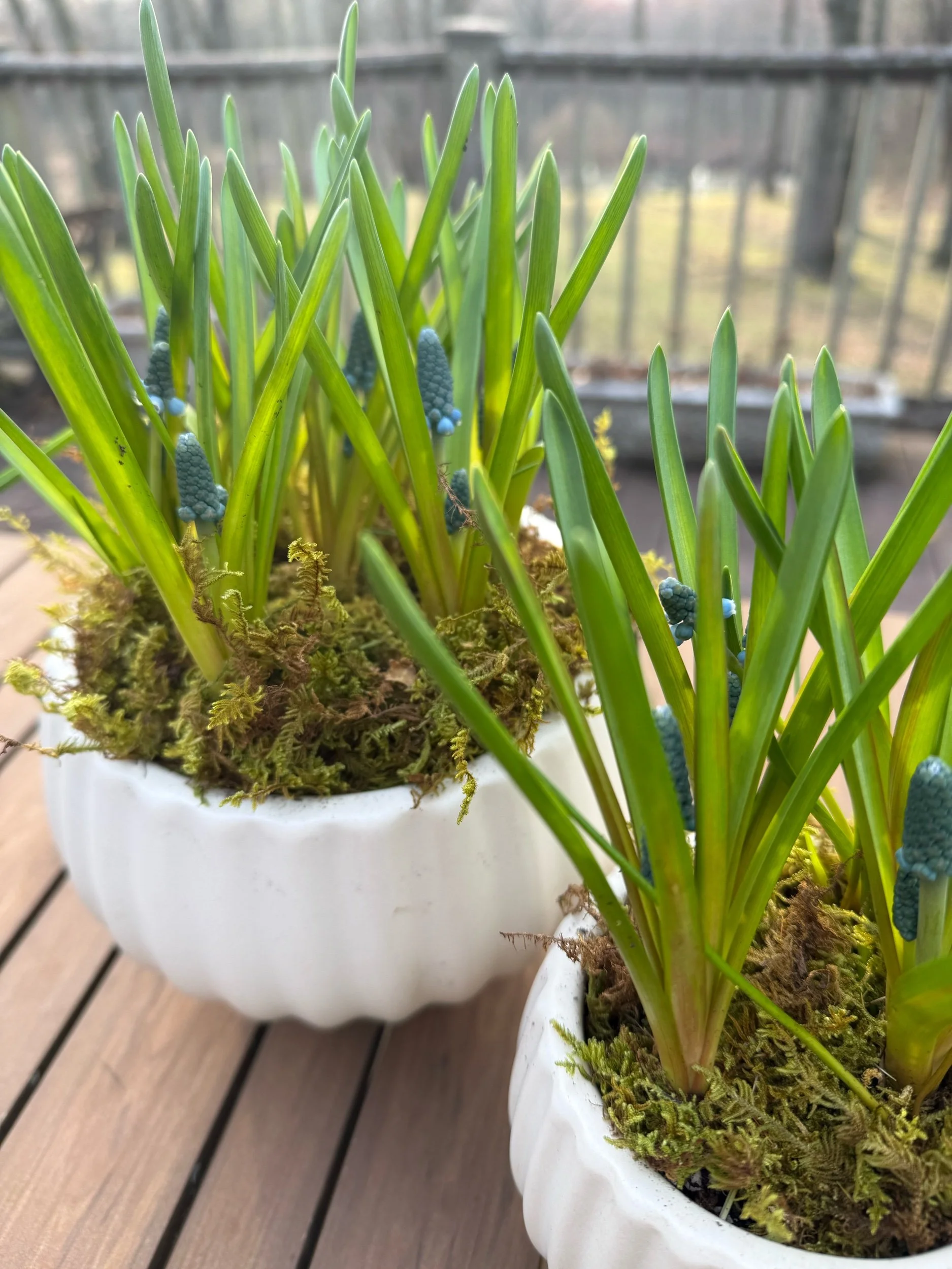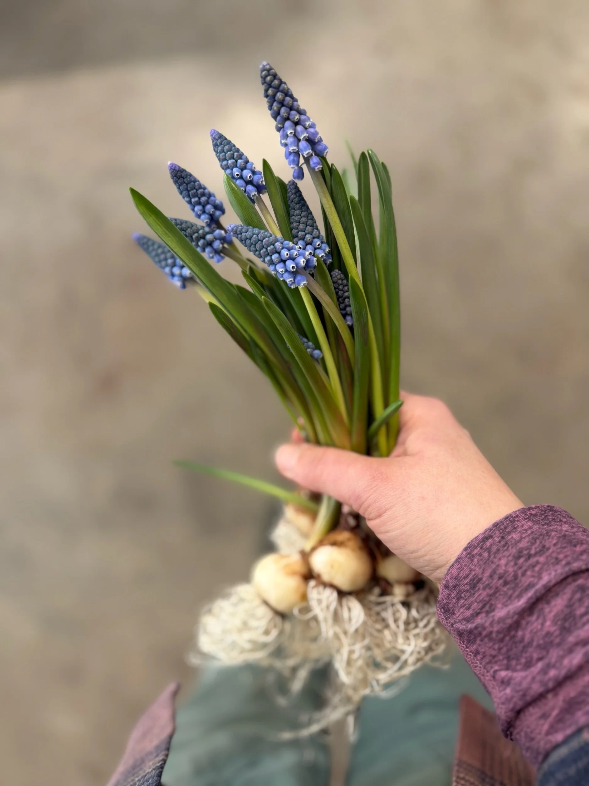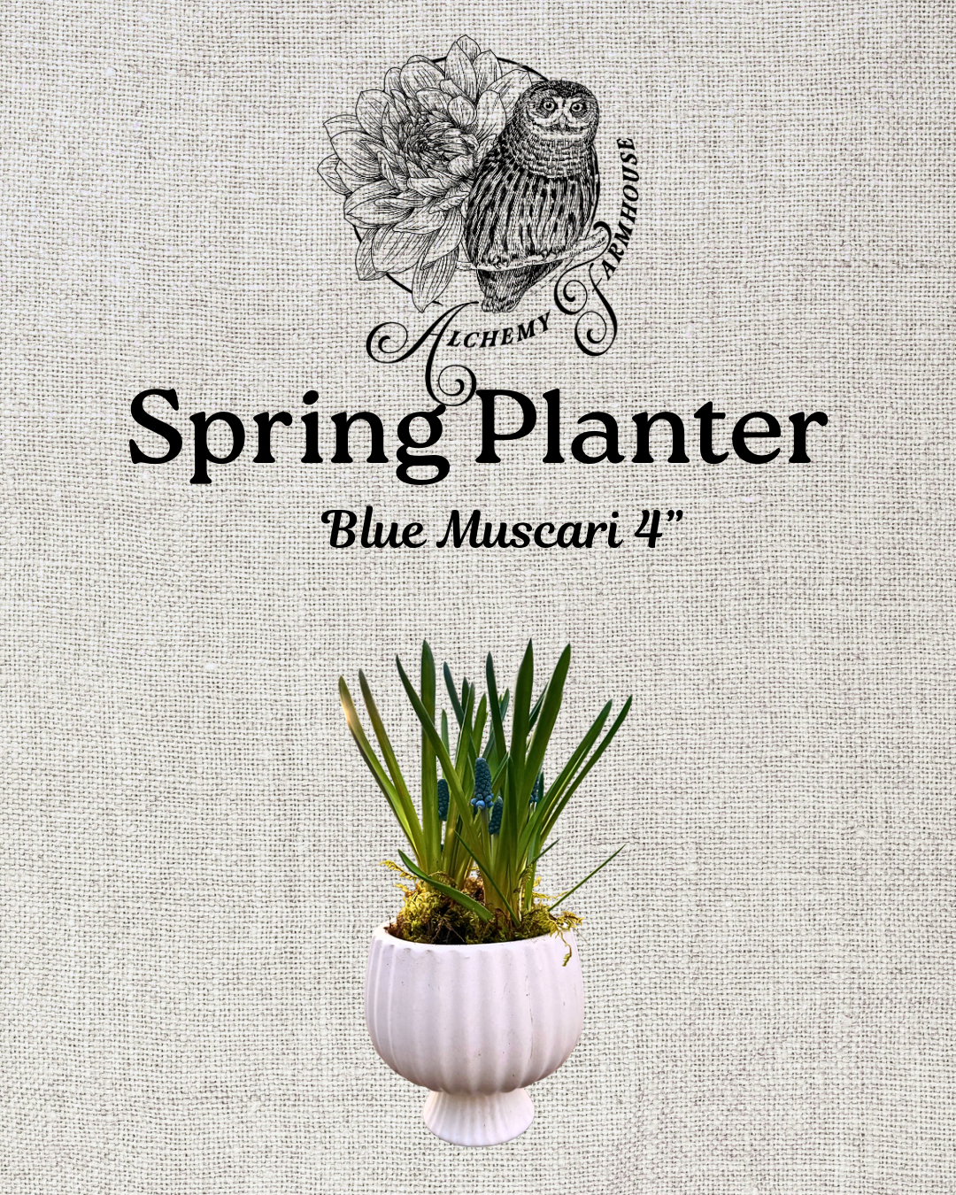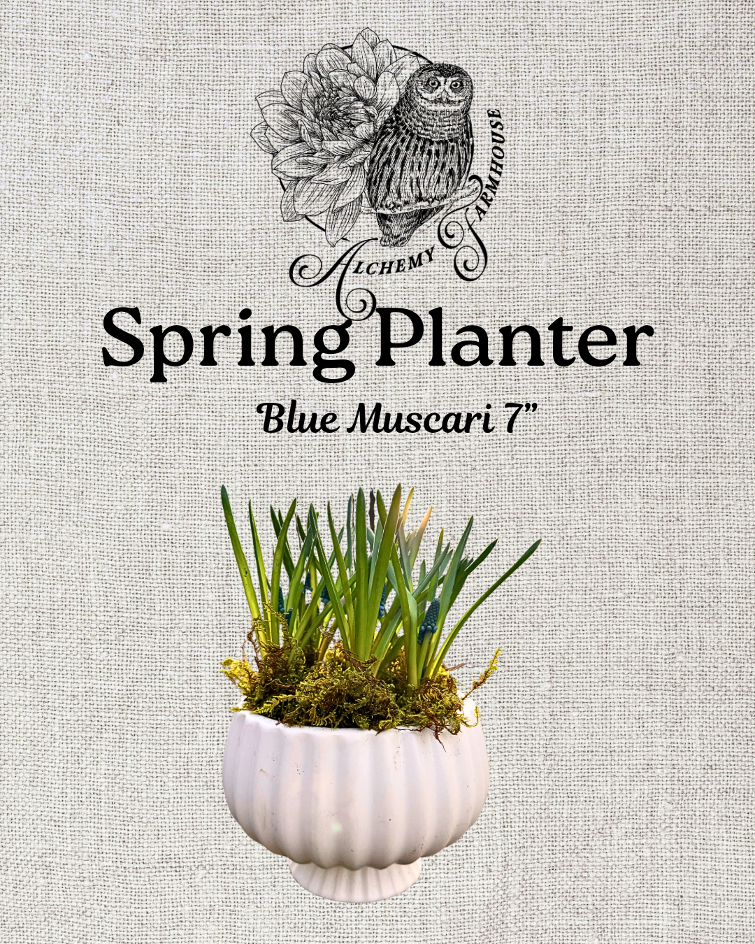 Choose from 4” or 7” compotes featuring blue Muscari bulbs. Planters will bloom in a few days and bring a show for a few weeks. After blooming, bulbs can be tucked into your own garden to return again next Spring.